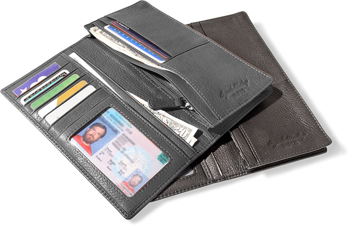 Made of genuine cowhide with a cashmere surface finish and a RFID lining. With the concern that personal information can be gathered and used for fraudulent purposes, it is prudent to protect your identity. If you still carry a checkbook, there is a space for that. If not, use that space for cash, coupons, notes or other papers. Unfold to an ID window for your driver's license, a total of eight credit card or business card slots, three full-length slip pockets, the checkbook pocket and a zippered coin or stash pocket. If you prefer to carry all of your means of payment in one wallet, this is it. Nylon lining. Choice of brandy or black. Measures 3-1/2" x 5/8" x 7-1/4" long. Weighs 3.1 oz.