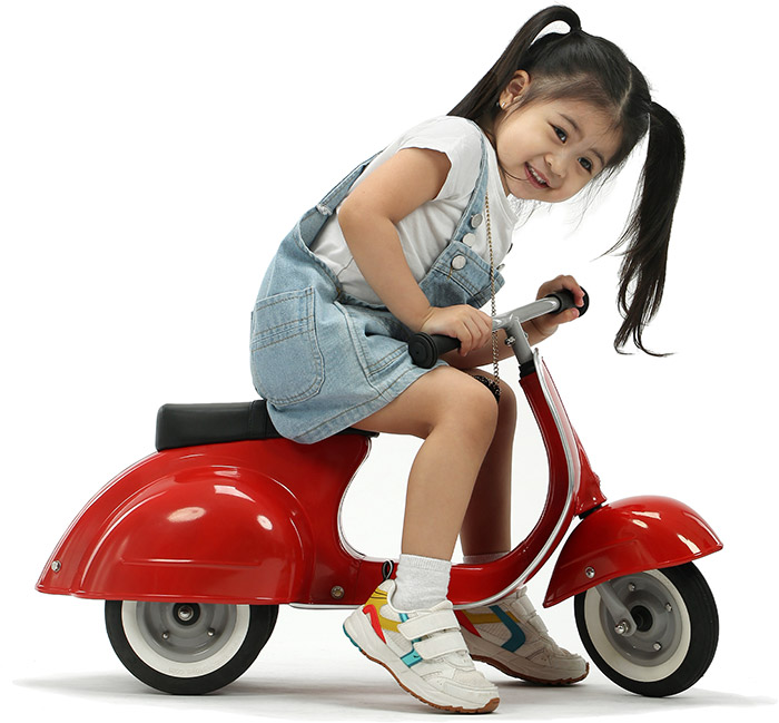 This ride-on scooter in vibrant red is perfect for boys or girls from the toddler age up to five years old. It would also make a wonderful gift for the classic vehicle enthusiast. Built for longevity, it combines classic Italian design with the finest craftsmanship. The frame consists of solid metal sheets, welded by hand out of several individual pieces, then powder coated in fiery red with aluminum trim added for extra stability, protection and a pure vintage look. Two round metal plates are powder coated gray and bolted together to create each wheel rim. The tires are smooth black plastic with a white wall for authenticity. The handlebar, fork and drivetrain are hand-bent metal tubes with a gray powder coating, while the handles are black plastic. Faux leather covers the soft cushioned seat for maximum comfort. Propelled by the rider, it provides a quiet, smooth ride while at the same time stimulating their motor and coordination skills. Winner of the Best Toy of 2019 by the American Specialty Toy Retailing Association. Max weight around 44 lbs. Measures 30" long x 12" wide x 17" tall (handlebar). Seat height is at 12-1/2". Weighs 13 lbs. Made in Vietnam.
